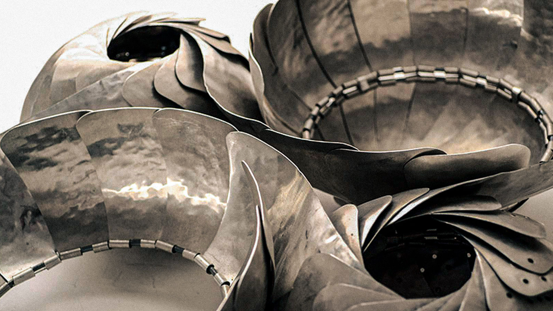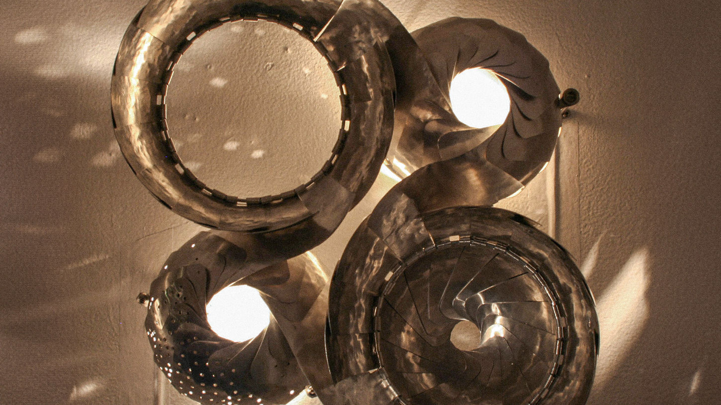 Fields is a transforming aperture field built around a patented overlapping-leaf mechanism, scaled up into a dynamic installation of light and form. Each component was fabricated using a combination of digital precision and handcraft—laser-cut aluminum sheets were hammered over molds, rolled, and meticulously assembled into kinetic fixtures.